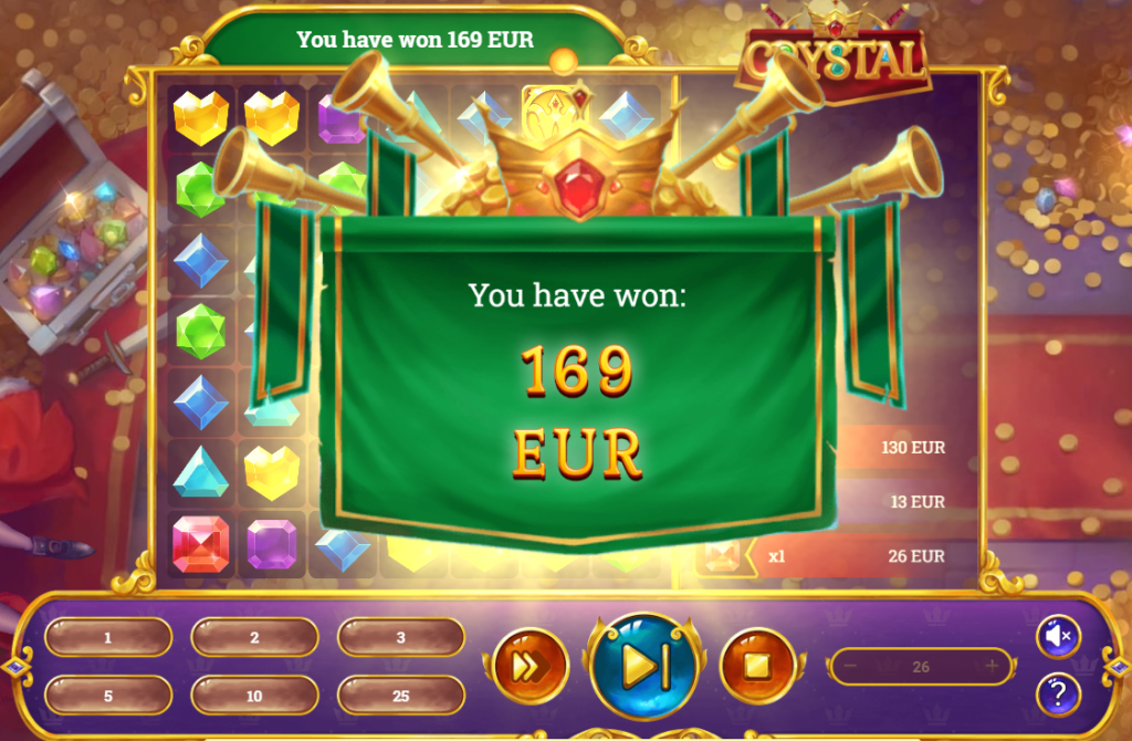 L’écran de jeu affiche une grille remplie de cristaux de six couleurs différentes : rouge, violet, vert, jaune, bleu clair et bleu foncé. Pour remporter un gain, vous devez former un groupe d’au moins 5 cristaux identiques qui se touchent directement.